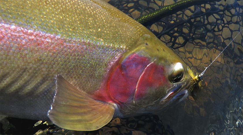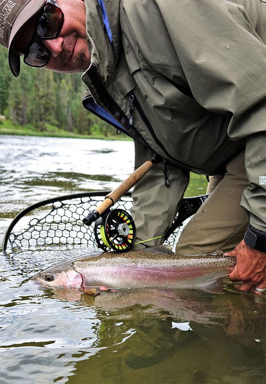 Have it all. It's just so easy to still get your grip 'n grin hero shots and keepemwet. Bryan Huskey presents a handsome wild rainbow for the camera. Ian Malepeai photo.