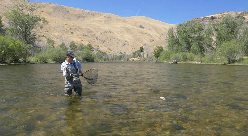 Upstream fight, downstream net. I like to use the current to my advantage when playing fish. This means working to steer the fish into softest water possible anytime it's down stream of me, and into heavy water if it's trying to run upstream. I keep this in mind when watching for opportunities to net fish. When I think it's time to net a fish, I'll do what I can to intentionally maneuver the fish upstream and rotate my position below. At that point, the current is going to aid pushing the fish directly towards me, and I'll try to get the fish up on the surface and into a "slide" directly towards me. At the last moment really lift to get the fish's head up then drop the net in front of the fish at the last second. I like to wait till the last second to stab the net into the water so the fish doesn't see the net until it's too late.