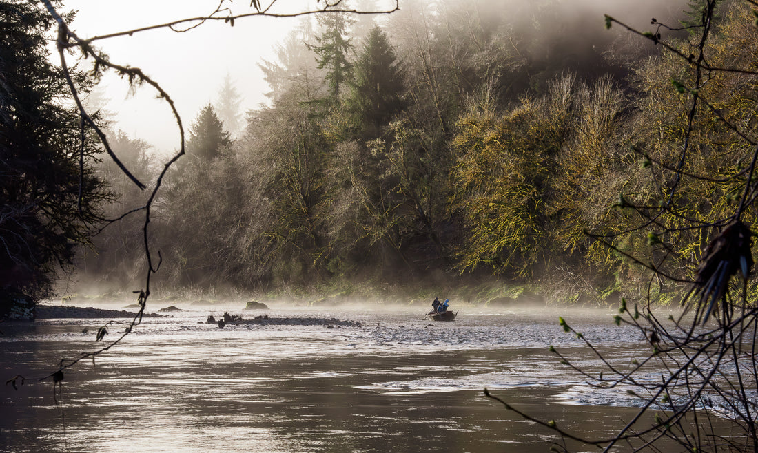 Day two was wholly unlike day one. Overnight, rain had soaked the coast, turning the rivers to growling torrents that churned with energy. The air was thick with a penetrating dampness that clung icily to our bones. Stepping into the river that morning, I was struck by an overwhelming sense of connection to these fish. It was a powerful emotion that wasn’t so much about understanding them, as it was about fulfilling a shared and inexorable promise to return to the places that matter most. The smells of cow dung, pine, mushrooms, ferns, decaying earth, and a persistent dampness that can only come from year-round rainfall hung in the air as we departed the boat launch. Ocean mist penetrated the forest, snaking and swirling across the water and into the trees, causing them to drip with moisture onto the forest floor and back into the river.