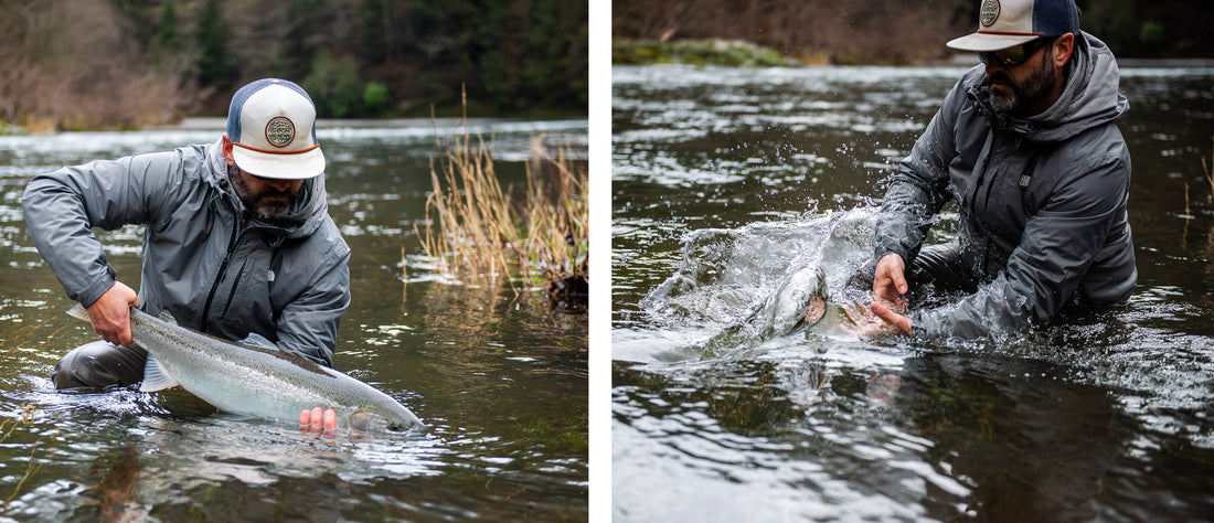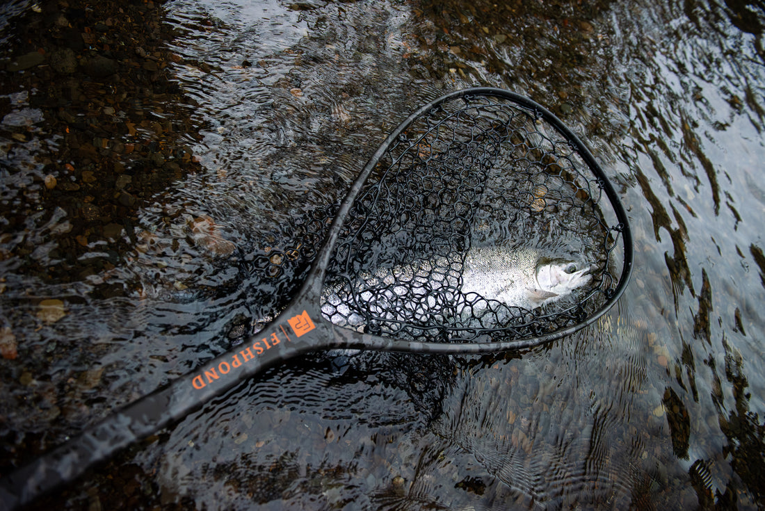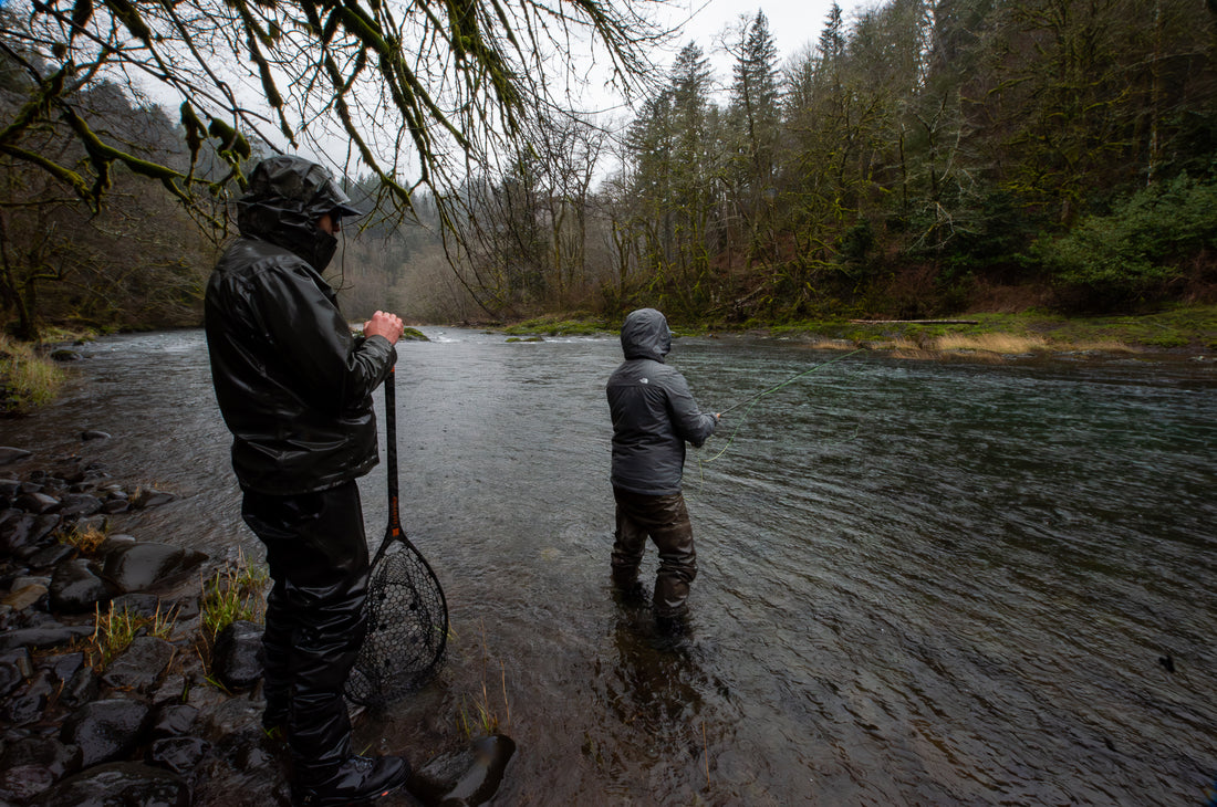 And then, there were fish. Their shimmering scales and near-perfect form belied the intense difficulty of their migration, often thousands of miles long and fraught with peril. They confirmed what the initiated steelhead angler knows: once you’ve got steelhead in your veins, you’re never getting them out. Steelhead don’t just grab your fly—they grab your soul. The moment they attempt to rip the rod, line, and reel out of your hands marks a turning point in your life. After feeling the alarming power of these gleaming bars of silver, fresh out of the ocean take a fly, it’s hard to go back to anything else. Justin ushered us into those moments multiple times that day, a monk guiding us up the temple steps. On days like these, gear often makes the difference between comfort and complete misery, and we were glad to be armed with rain gear, packs, and landing nets that allowed us to savor the fleeting moments that defined our endeavor.